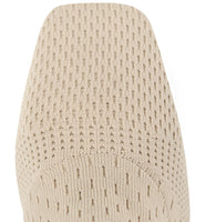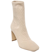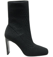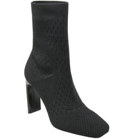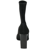 A stretchy shaft delivers a perfectly customized fit in this minimalist sock-like bootie featuring a square toe and flared heel
