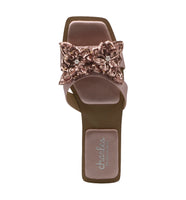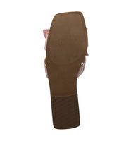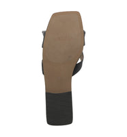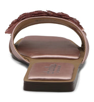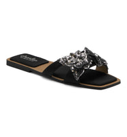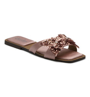 A floral applique is the center of attention in this slide sandal, featuring a square toe and padded footbed