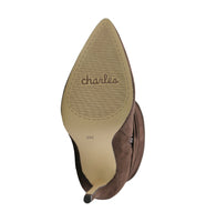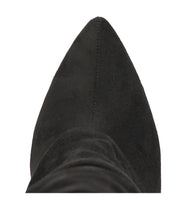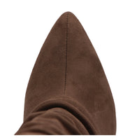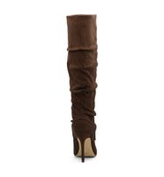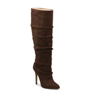 A slouchy boot that is elevated with an almond toe and stiletto heel