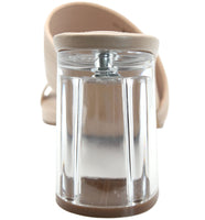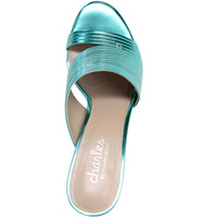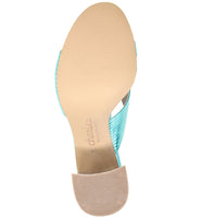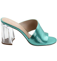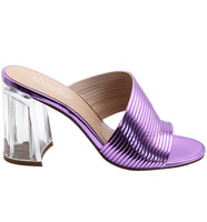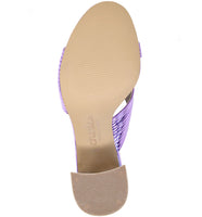 A wrapped, architectural heel heightens the statement style of this sandal featuring an asymmetrical band with an elastic inset at one side.