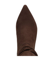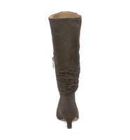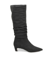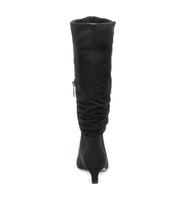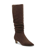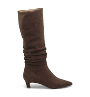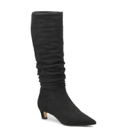 A slouchy shaft and almond toe bring contemporary elements to a striking knee-high boot on a kitten heel, that spells comfort for everyday wear