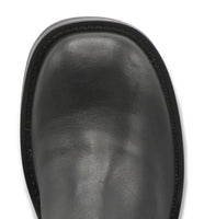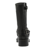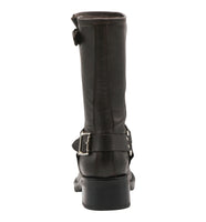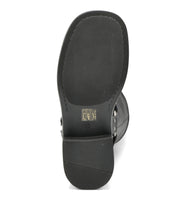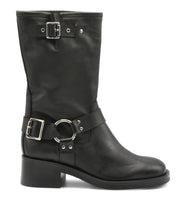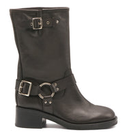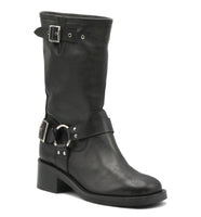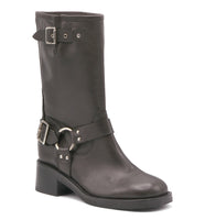 A leather boot that is enhanced with studs, a buckle and other metal hardware - Made in Italy