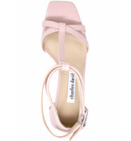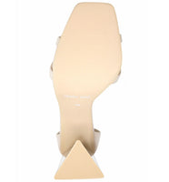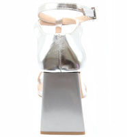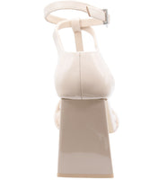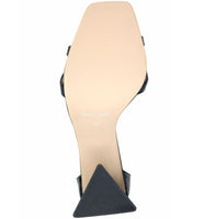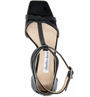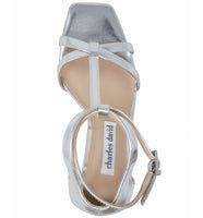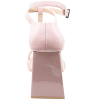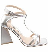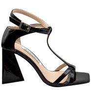 Criss-crossed, t-ankle strap is enhanced by a geometrical heel