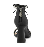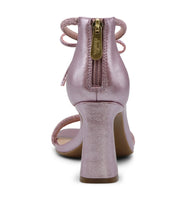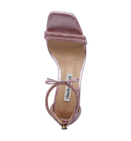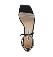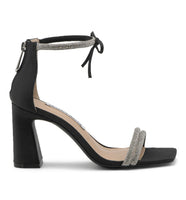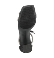 A squared-off toe and block heel balance this sandal fashioned with a rhinestone encrusted single strap on the vamp