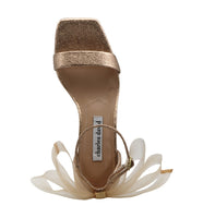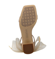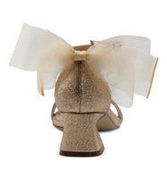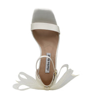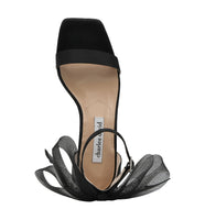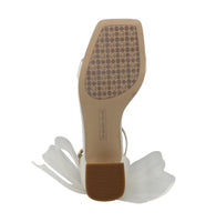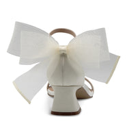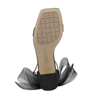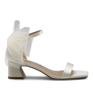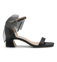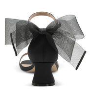 This sandal sits on a block heel with an ankle strap on a square toe with a tulle bow to elevate the look