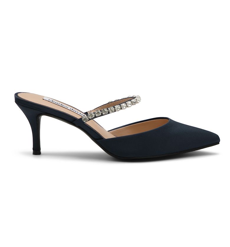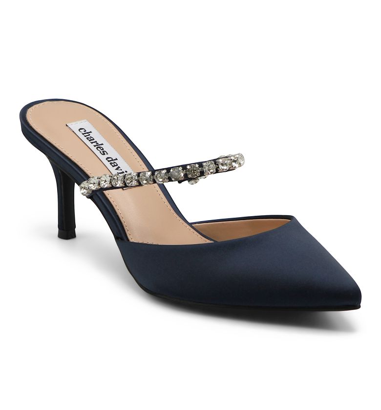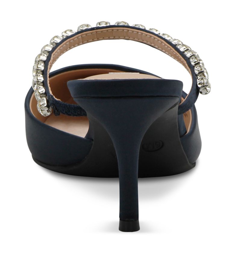 Dazzling rhinestones enhance the vamp of this mule