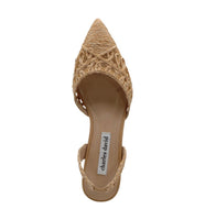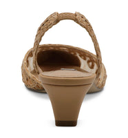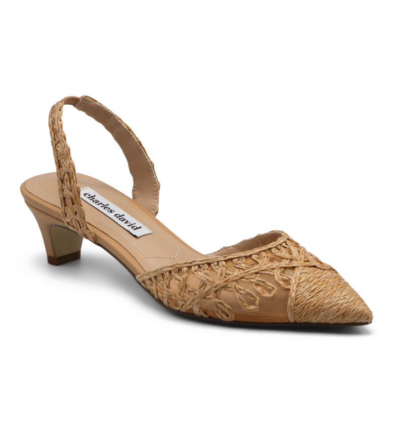 What a breath of spring this sandal brings with its woven pattern on a kitten heel