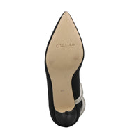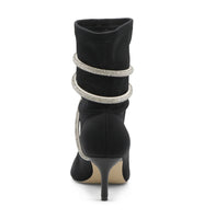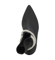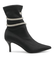Everything you want in a bootie, pull on stretch fabric, pointy toe, comfortable heel height with a touch of glam around your ankle