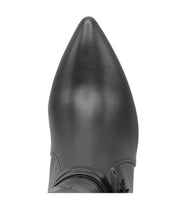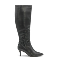 A classic boot on a stilleto heel and side zip entry, with an added floral circlet around the