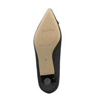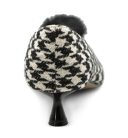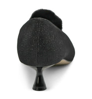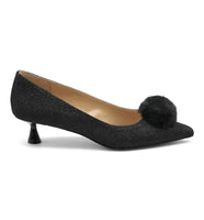 A delicate pom sits atop the vamp of this pointed toe pump, lifted by a tapered kitten heel