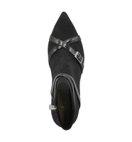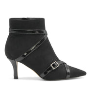 Straps with buckle hardware wrap around this bootie which sits on a stiletto heel making you feel secure every step of the way