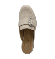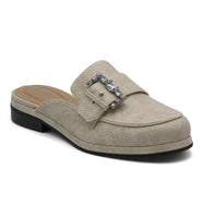 A jewel-enhanced buckle takes this loafer inspired mule to the next level, fashion meets comfort