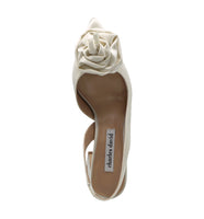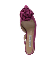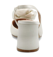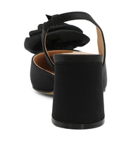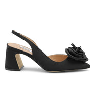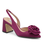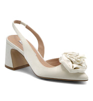 A floral vamp accent adds contemporary intrigue to a slingback pump balanced by a pointy toe and flared block heel
