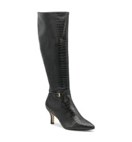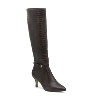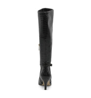 A buckle strap at the ankle adds a chic element to this knee high boot